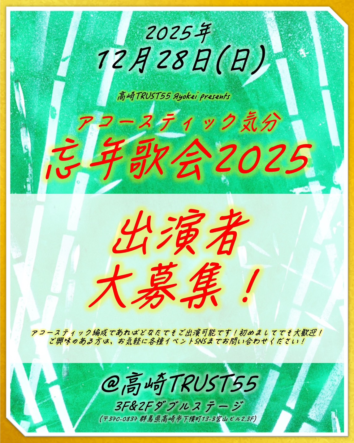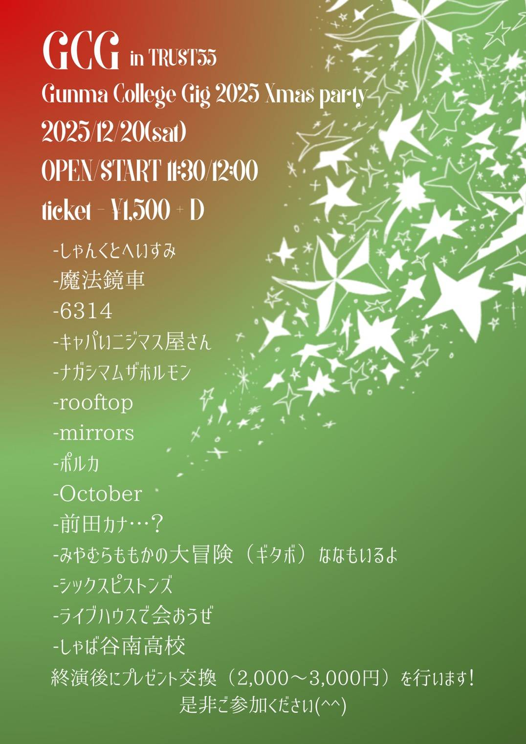 Gunma College Gig2025 Xmas party 出演 しゃんくとへいすみ 魔法鏡車 6314 みやむらももかの大冒険(ギタボ)ななもいるよ ナガシマムザホルモン rooftop2 mirros ポルカ October 前田カナ...? キャパいニジマス屋さん シックスピストンズ ライブハウスで会おうぜ しゃば谷南高校 ![]() |