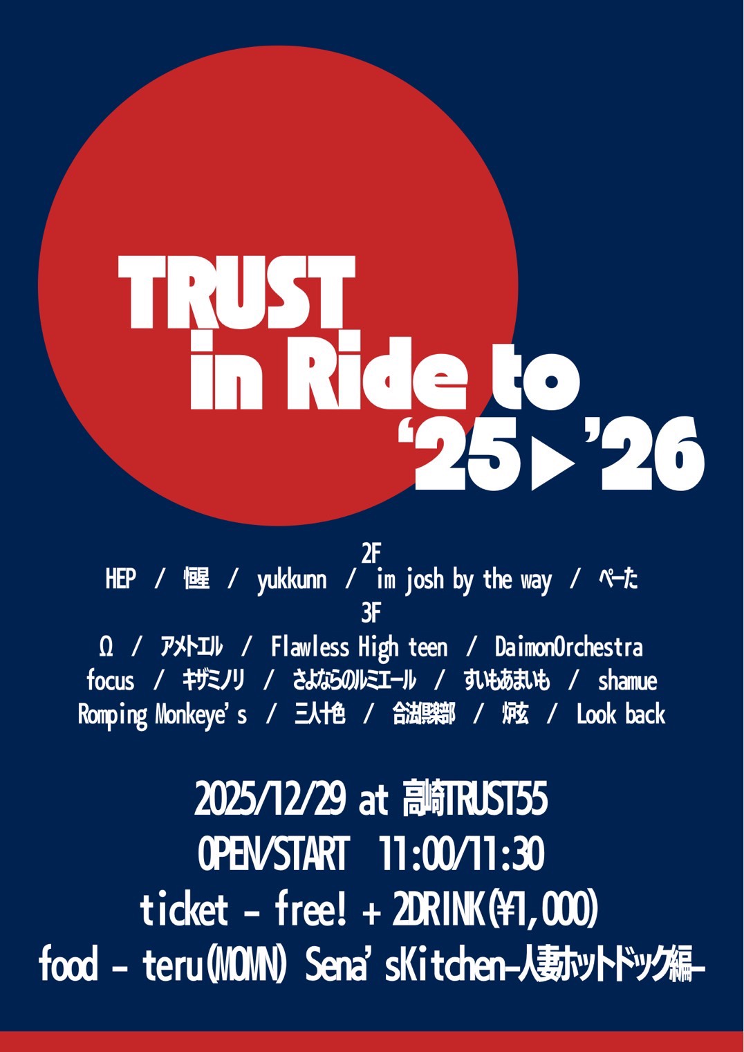 TRUST in Ride to '25➤'26 出演 2F 恒星 yukkunn HEP im Josh by the way ぺーた 3F Ω アメトエル Flawless High teen DaimonOrchestra focus キザミノリ さよならのルミエール すいもあまいも shamue Romping Monkeye's 三人十色 合法倶楽部 炉玄 Look back ![]() |