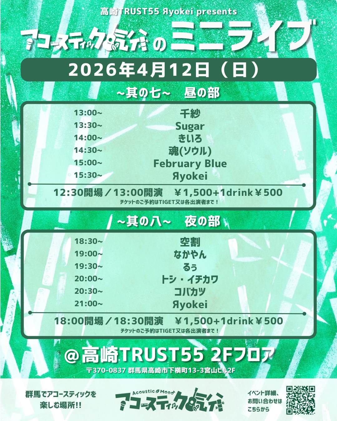 高崎TRUST55 Яyokei presents アコースティック気分のミニライブ 〜其の八〜 出演 空割 なかやん るぅ トシ・イチカワ コバカツ Яyokei ![]() お問い合わせは、お電話 又はこちら からお願いします |