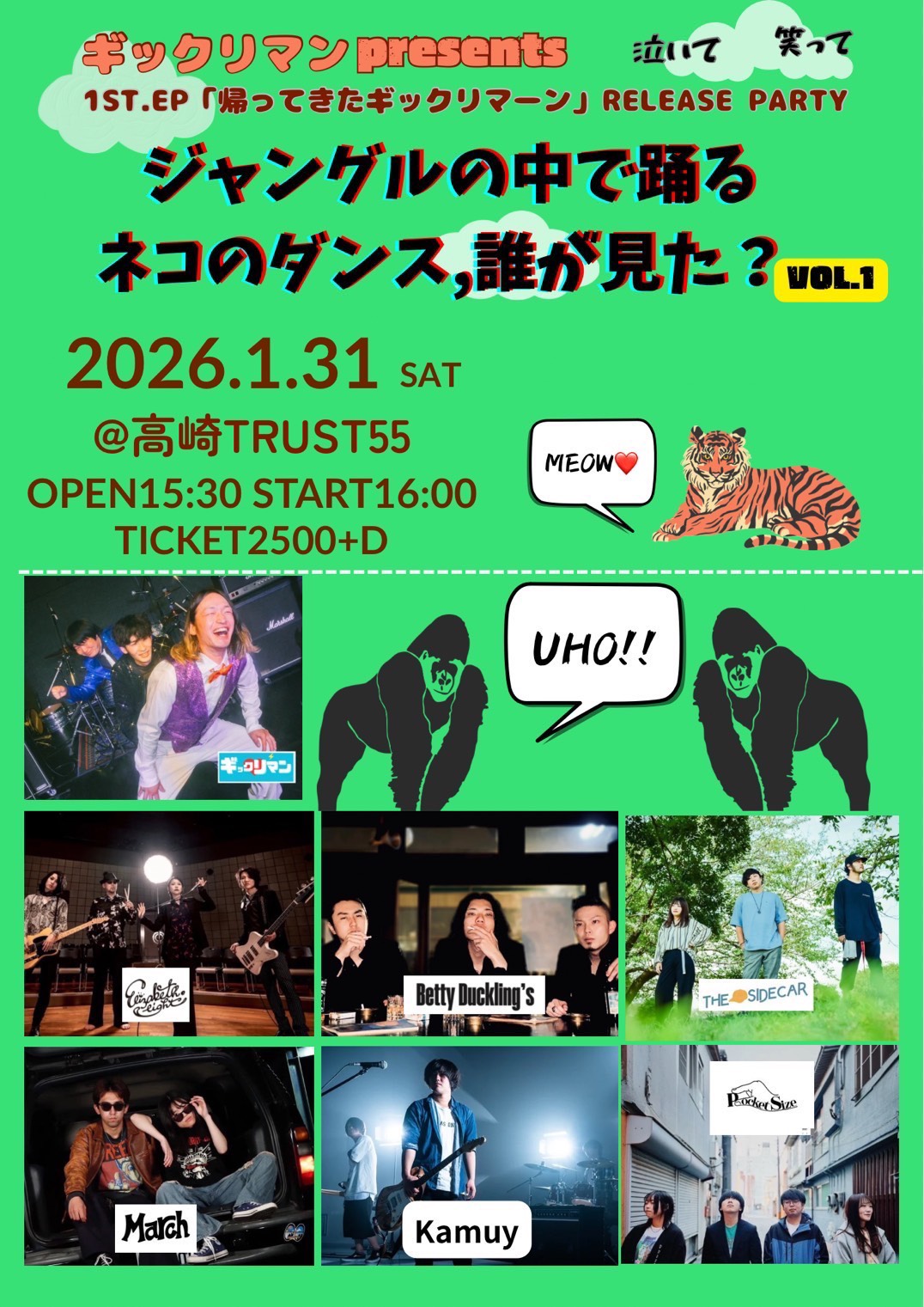 ギックリマン presents 1st.EP「帰ってきたギックリマーン」release party ジャングルの中で踊るネコのダンス、誰が見た? vol.1 出演 Kamuy March THE SIDECAR Betty Duckling’s Elizabeth.eight Pocket Size ギックリマン ![]() |